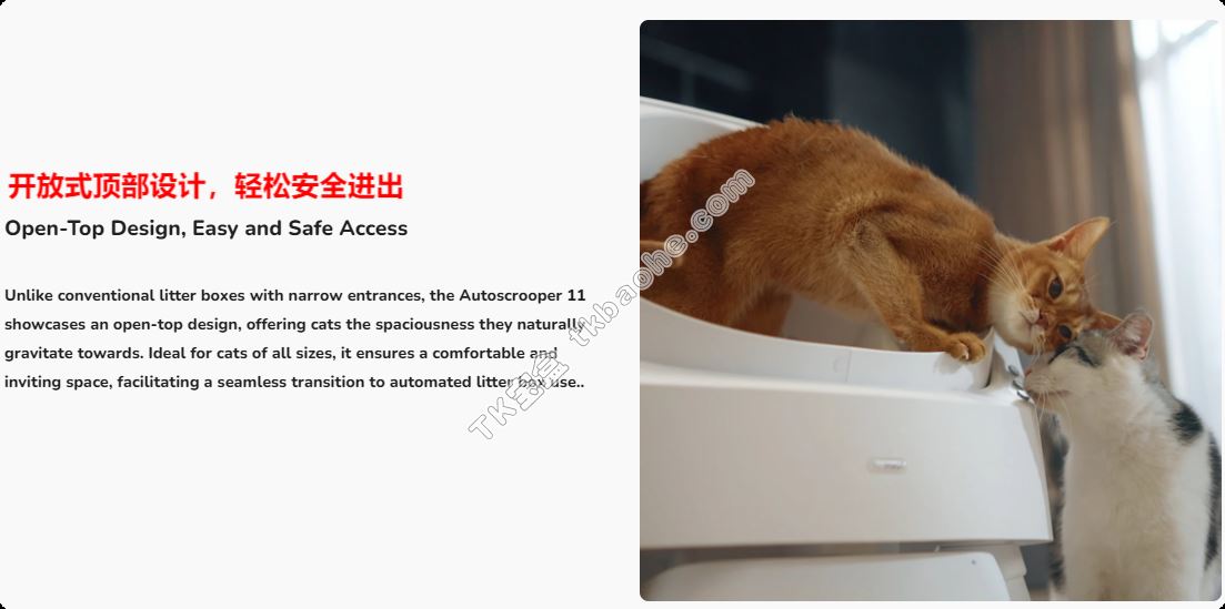 - 采用开放式结构,彻底消除夹猫隐患,适配最大25磅(约11.3公斤)的猫咪体型;