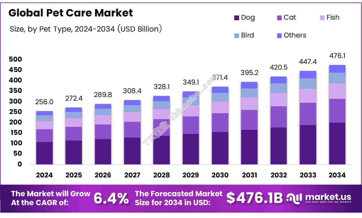 - 全球宠物护理市场规模预计2034年达4761亿美元,2024年为2560亿美元,十年复合增长率显著;