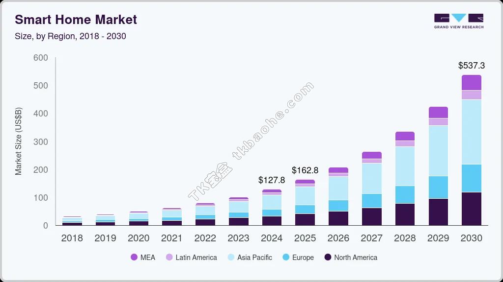 据grandviewresearch数据显示,全球智能家居市场自2018年起进入高速增长通道,2024年市场规模估值达1278亿美元,预计2025-2030年间年均复合增长率将达27.0%。