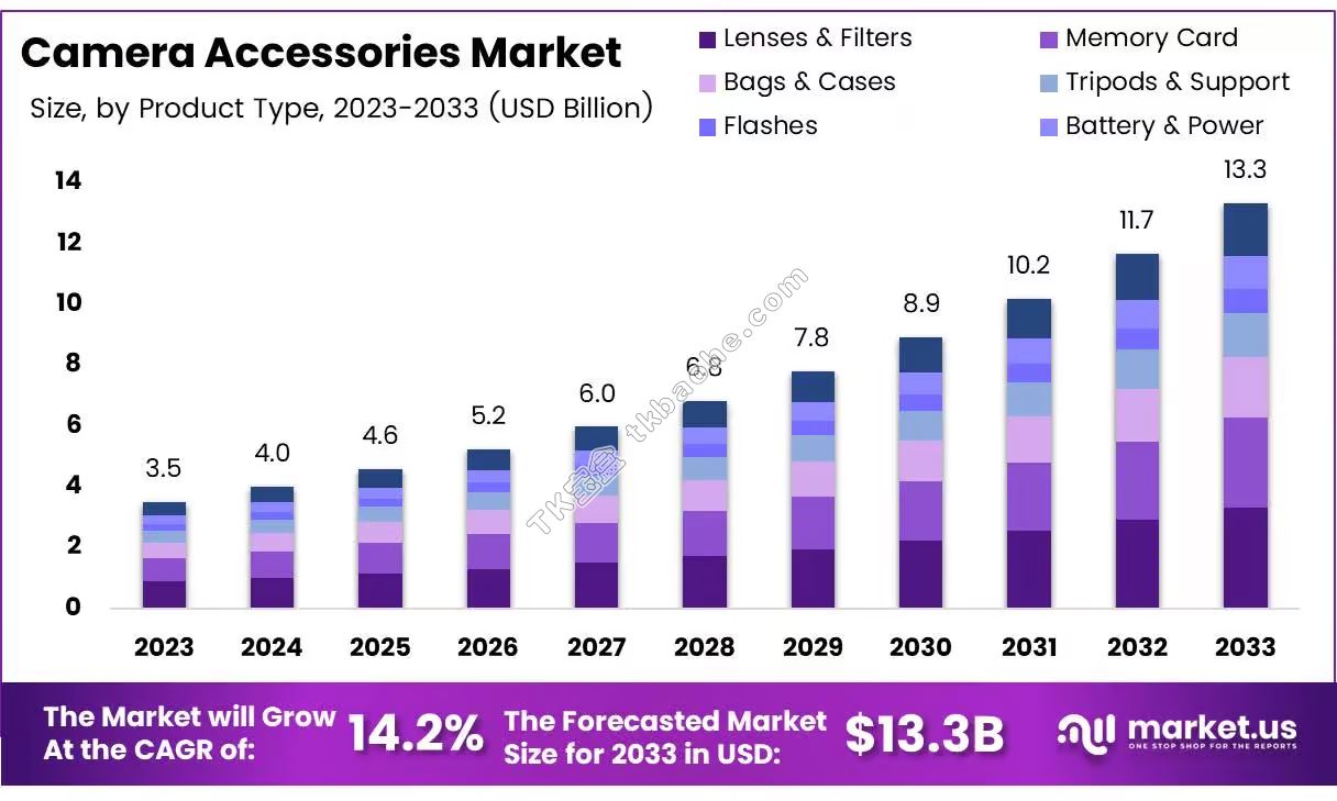 全球摄影配件市场规模在2023年估值为35亿美元,预计到2033年将增长至约133亿美元,预测期内复合年增长率高达14.2%,行业发展势头十分强劲。