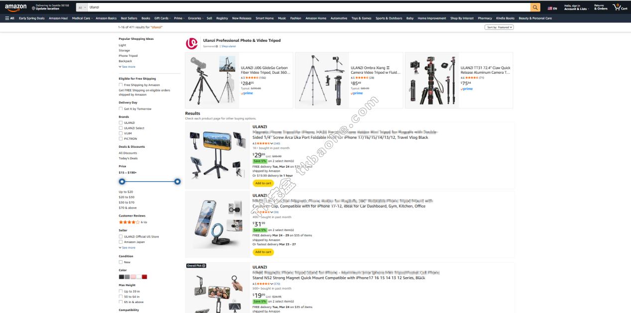 在线上渠道方面,Ulanzi采取了多平台布局的策略。亚马逊是其全球化的核心阵地,贡献了30%的海外营收。品牌深耕北美、欧洲、日本等核心站点,在摄影配件类目长期稳居TOP10。