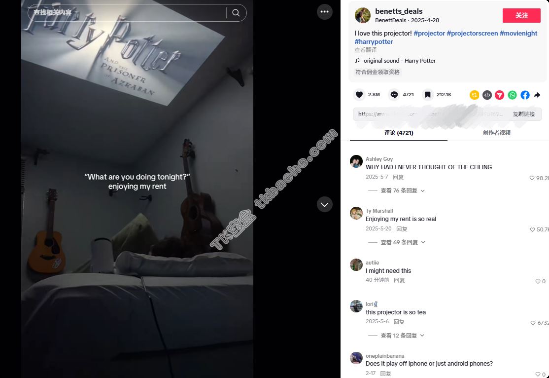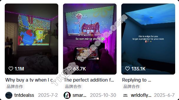 从这些达人发布的内容来看,可以大致分为两种类型。一类是场景化生活展示。这类视频的核心是“造梦”,达人会在卧室里、客厅地毯上、户外露营帐篷里,用Magcubic投影仪看电影、打游戏、开派对,通过人物体验来传达产品的便携性和氛围感。