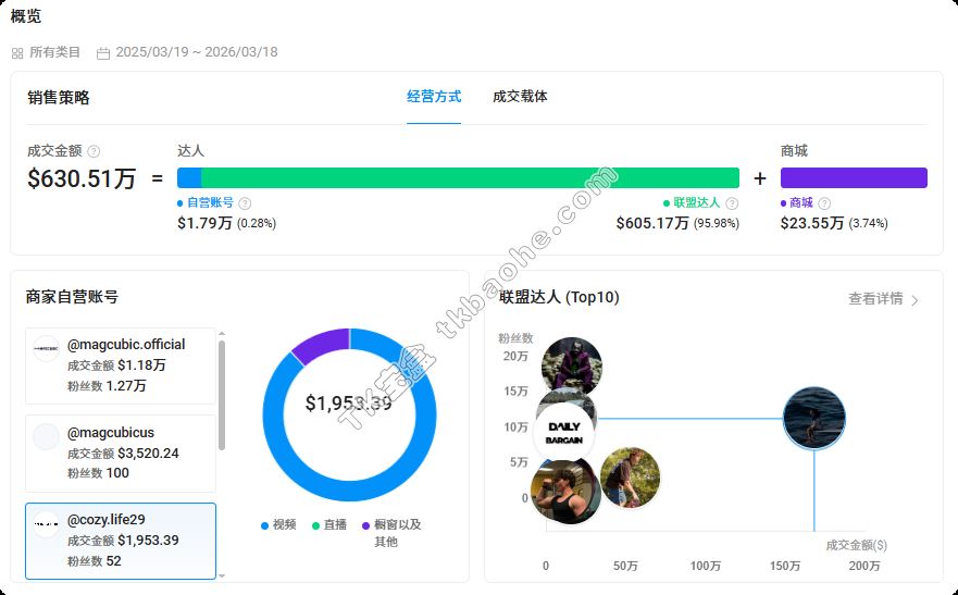从公开信息和第三方调研内容可以看到,Magcubic品牌在海外社媒尤其是TikTok上投入较多精力。我们先看数据,如下图,这是Magcubic品牌美区本土店Magcubic shop近一年的数据。在这一年里,他们共斩获近630.51万美元的成交额,约合人民币4340万元。其中,联盟达人所带来的成交金额达到了总额的95.98%,可以看出达人合作目前是Magcubic品牌在TikTok上的核心增长引擎。