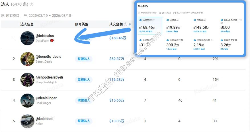 在达人选择上,Magcubic品牌的策略非常清晰:放弃头部顶流,主攻腰尾部达人,通过海量铺量实现病毒式传播。比如,在Magcubic shop近一年的带货达人榜上,排名第一的达人@tntdealss(粉丝数11.32万)累计销量就达到5.31万台,销售额突破168.46万美元,合作视频总流量2.19亿次。