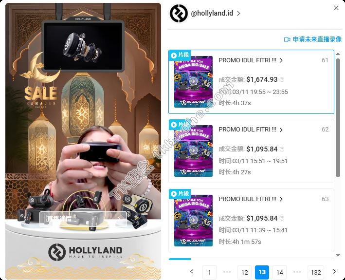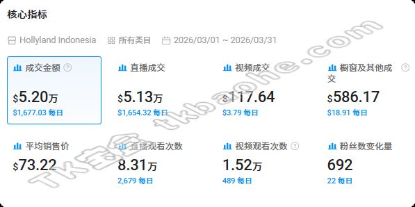 从销售转化效果来看,Hollyland的内容并不算出彩,销售大头主要来自TikTok直播。以印尼账号@hollyland.id为例,3月达成的销售额为5.2万美元,其中直播成交占比超过98%,足以见得直播的分量。