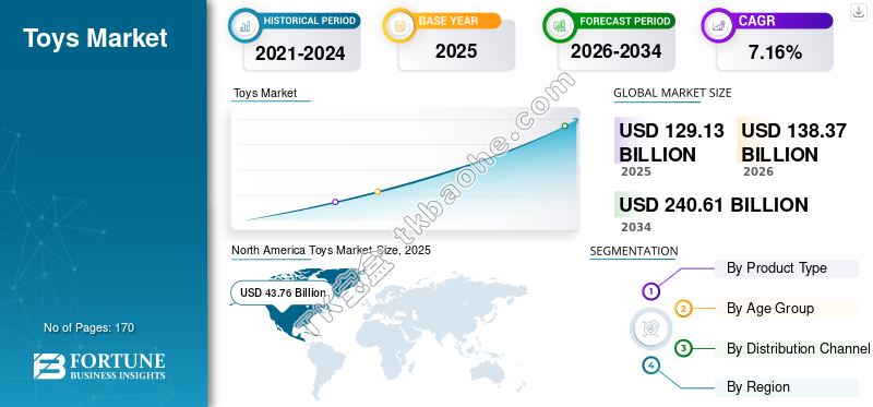 据fortunebusinessinsights的调查数据显示:全球玩具市场的规模在2026年估值为1383.7亿美元,预计到2034年将增至2406.1亿美元,期间几年的复合年增长率达到了7.16%。
