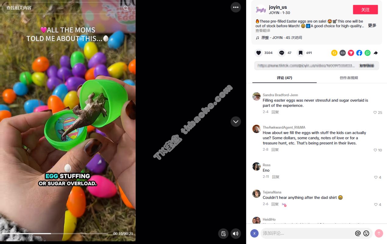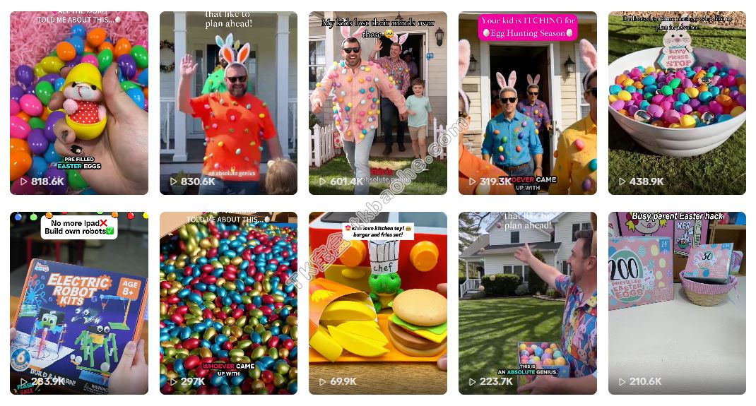 账号近期发布的多条营销视频,都围绕着这款复活节彩蛋套装展开。采用温馨家庭派对场景+产品开箱展示的结构。前半段用一家人其乐融融的画面吸引点击,后半段直接展示彩蛋里丰富的内容,让用户一眼就能看到产品的可玩性。这种做法的好处显而易见。一方面,短视频形式能直观传递产品的趣味性,激发用户的购买欲;另一方面,紧贴节日热点发布内容,可以在短时间内集中触达有相关需求的消费者,高效放大曝光量,最终反哺到线上、线下的实际销量上。对于预算有限的中小出海品牌来说,这种精准卡位节日的打法,比盲目投流要划算得多,非常值得借鉴。
