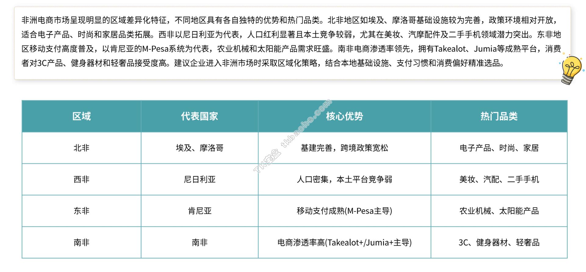 非洲54个国家并非统一市场,不同区域的基建水平、消费习惯差异明显,需针对性制定策略: