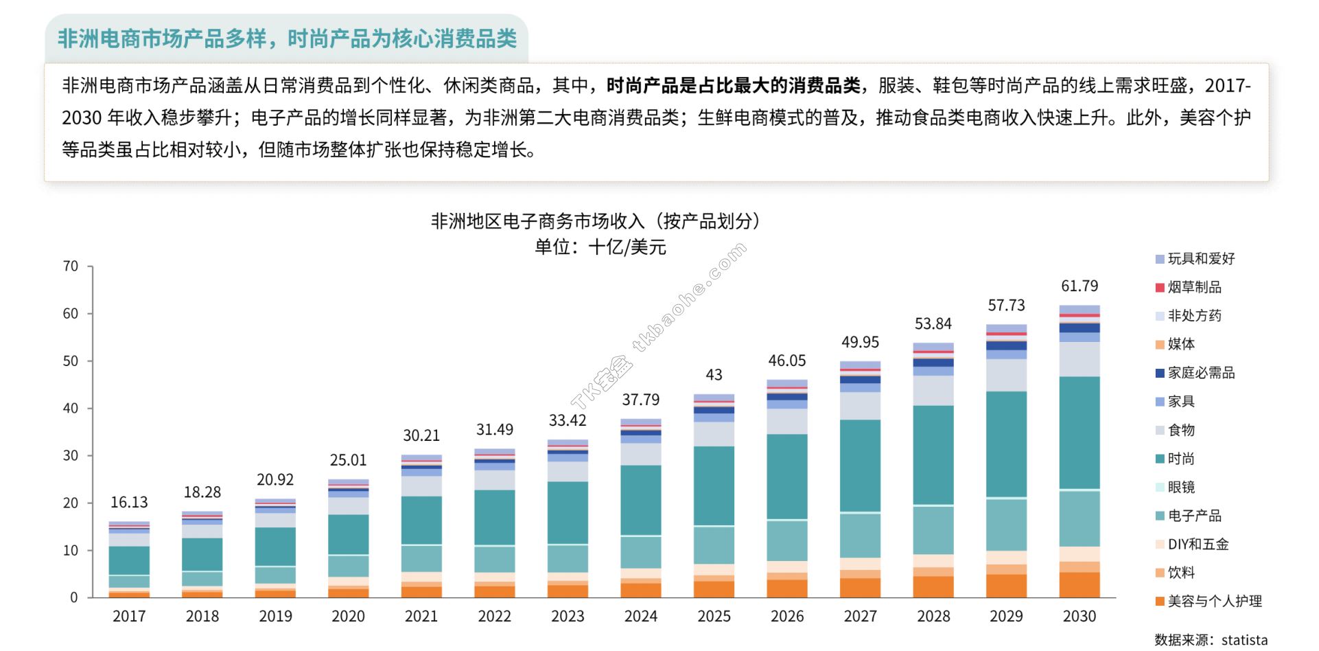 非洲消费者的购物车中,时尚产品与电子产品占据绝对主导地位。年轻人口对服装、配饰的旺盛需求,推动该品类实现年均两位数增长,预计到2030年,非洲时尚品类市场规模将突破230亿美元。