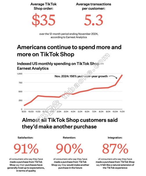 用户价值与消费频次: 在2023年11月至2024年11月期间,TikTok Shop的平均订单价值为35美元,每位消费者平均完成5.3笔交易。尤其在2024年11月,平台支出同比激增158%,增长动能持续强劲。