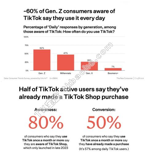 Z世代成为核心驱动力: 作为平台的绝对主力,60%的Z世代用户每日使用TikTok。在这群年轻用户中,已有50%的人进行过购物,且购买后的重复购买率高达75%,展现了极高的用户粘性与商业潜力。