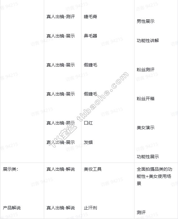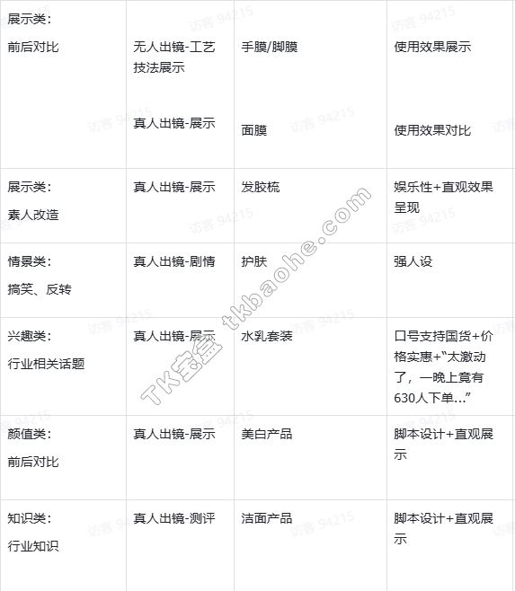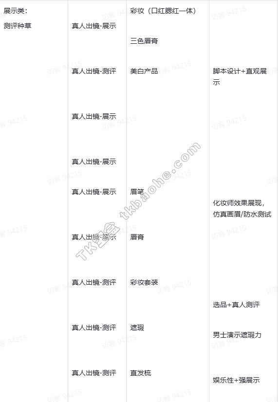 #### 3. 内容案例参考 以下案例按产品类目分类总结,核心是帮助商家理解美妆内容的创作逻辑——无需局限于特定品类,可借鉴“痛点解决、效果展示、干货分享”等思路,打造更多优质素材。多数高转化视频会融合多项优点(如“人设+干货+效果”),建议商家深入研究,提炼适合自身的技巧。