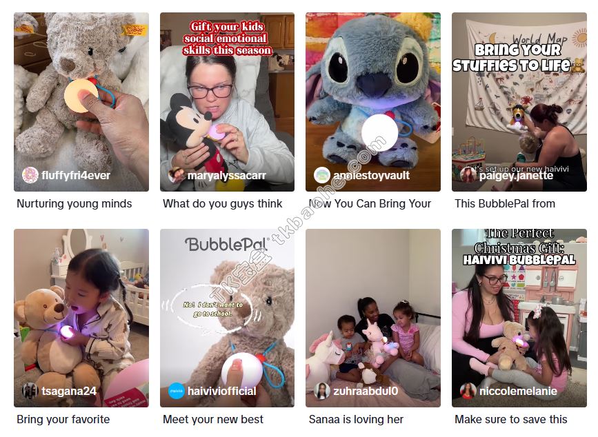 Haivivi选择与科技类、亲子类达人合作,拍摄充满生活气息的视频:孩子抱着毛绒玩具问问题、听故事、模仿角色声音……